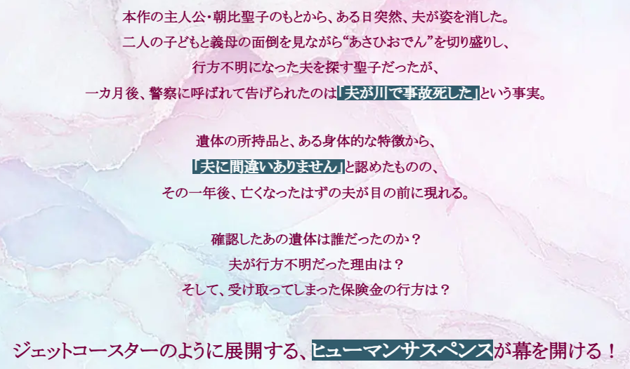 死んだと思った夫が急に帰ってきてから話が始まるサスペンスドラマ。